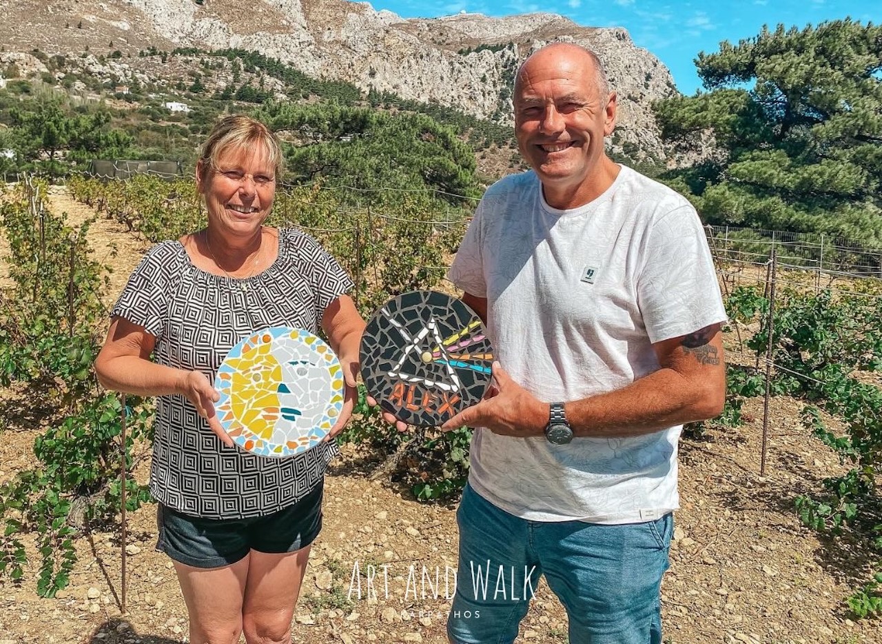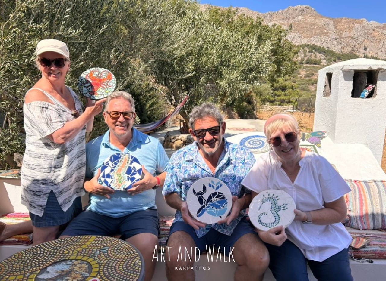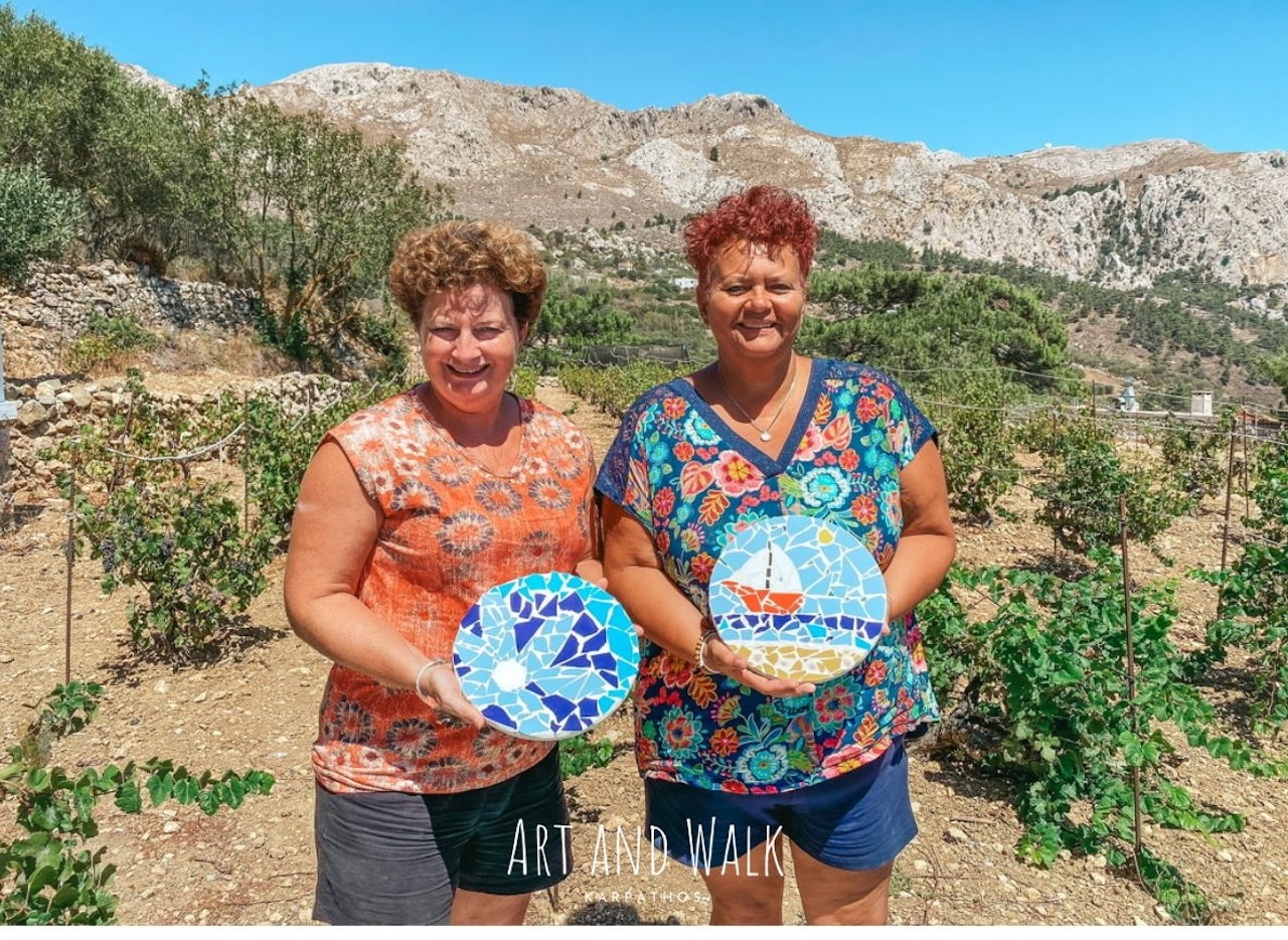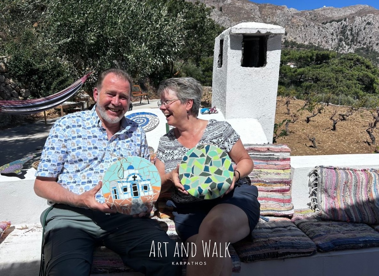 Please note: To ensure your mosaic sets beautifully, it will stay in our studio for at least 24 hours before grouting. We’ll keep your artwork safe until you pick it up, or we can deliver it to Pigadia for you.